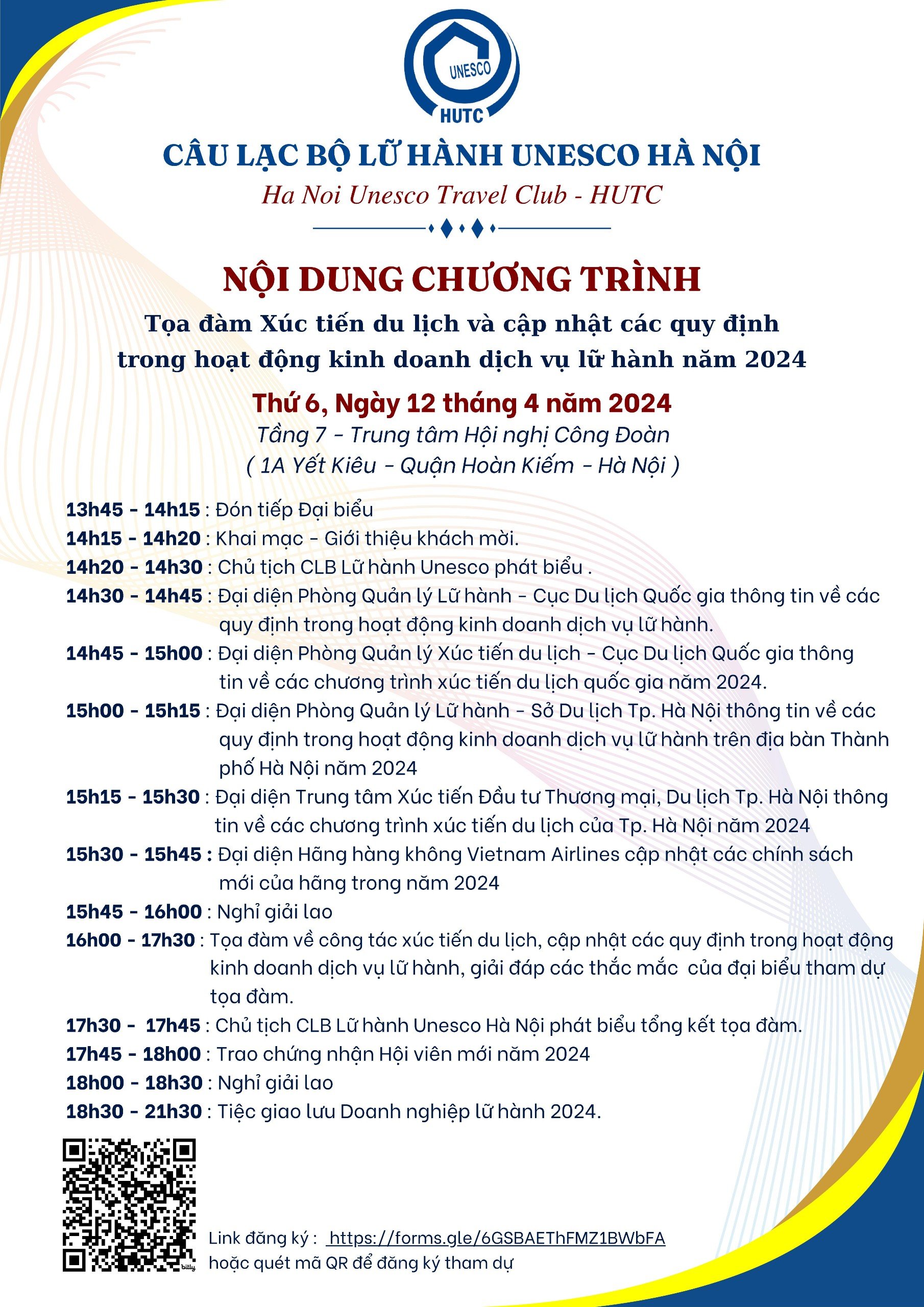 Trong khuôn khổ kế hoạch hoạt động của Câu Lạc bộ Lữ hành Unesco Hà Nội năm 2024 và nhằm mục tiêu hỗ trợ thiết thực, hiệu quả hơn nữa, giúp các Doanh nghiệp Hội viên Câu lạc bộ Lữ hành Unesco Hà Nội có cơ hội nắm bắt và cập nhật các quy định về hoạt động du lịch lữ hành đối với công tác quản lý nhà nước trong lĩnh vực du lịch lữ hành.