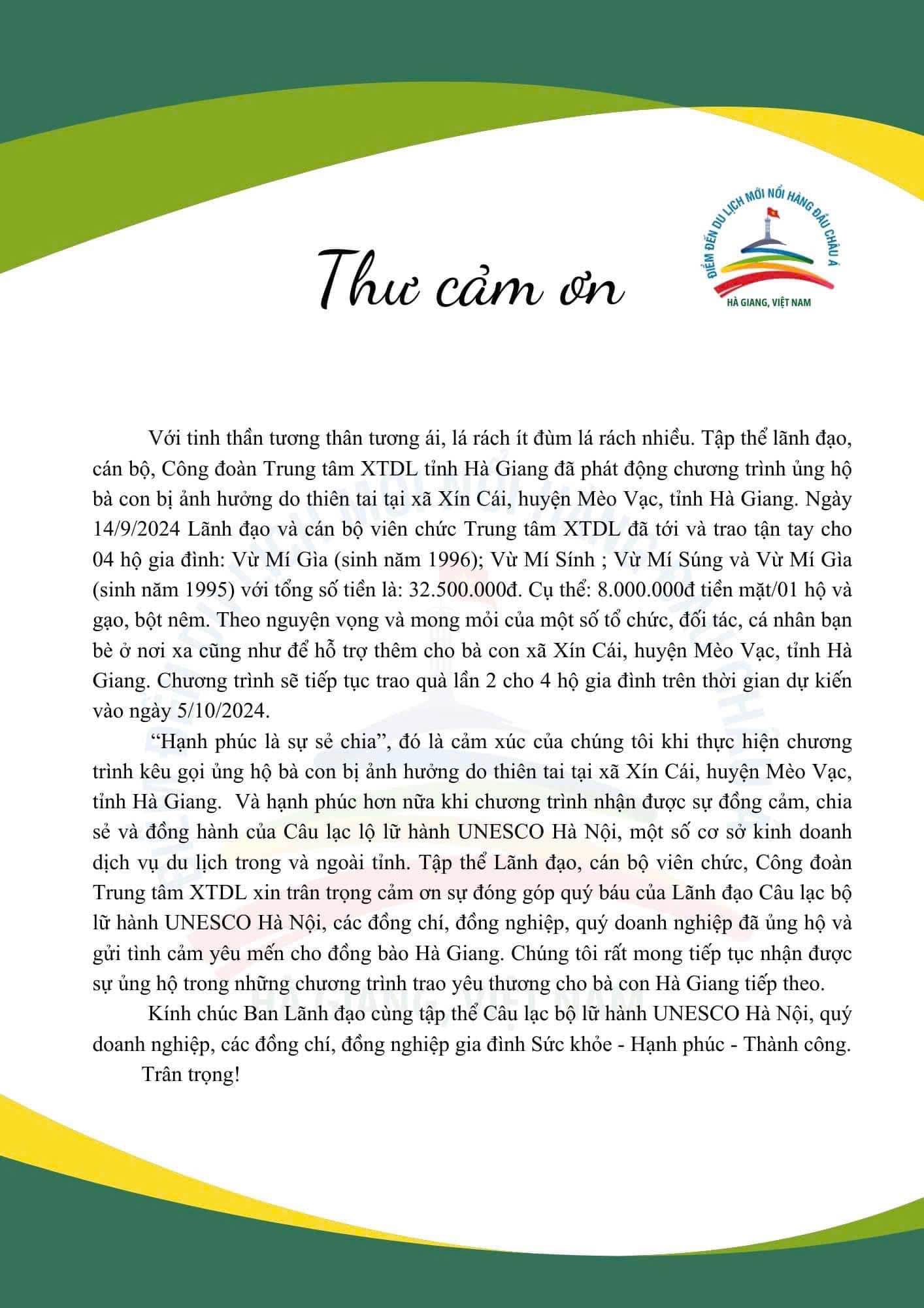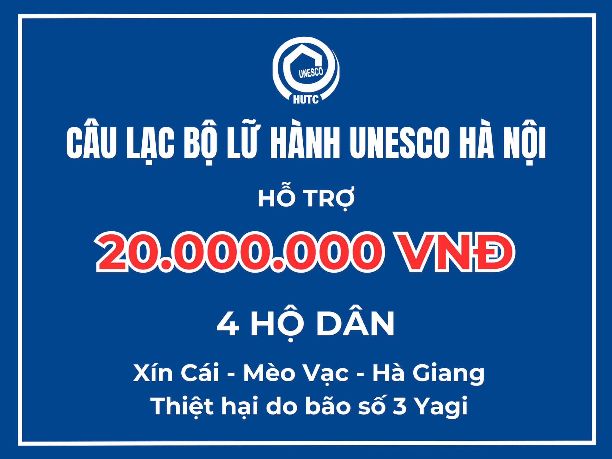 Ngày14/09/2024 đoàn Thiện nguyện CLB Lữ hành Unesco Hà Nội đã trực tiếp kết hợp với TTXT Du lịch Hà Giang ủng hộ 4 hộ gia đình thôn Bờ Sông, xã biên giới Xín Cái (huyện Mèo Vạc) bị sạt lở, tất cả nhà cửa và tài sản đều bị lũ cuốn trôi hoàn toàn. Số tiền ủng hộ là 20.000.000 VNĐ (Hai mươi triệu đồng)
