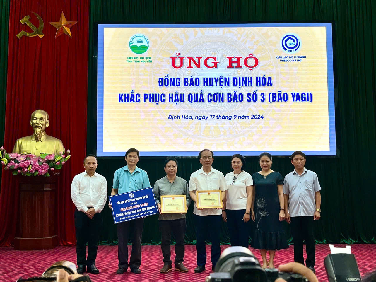 Để bày tỏ lòng cảm kích sự giúp đỡ kịp thời của CLB Lữ hành Unesco Hà Nội và các Nhà hảo tâm, Quý hội viên CLB đối với bà con tại địa phương, đ/c Lương Văn Ngân - Chủ tịch UBMTTQ VN huyện Định Hóa đã trân trọng trao Giấy Ghi nhận TẤM LÒNG VÀNG đến CLB Lữ hành Unesco Hà Nội, ông Trương Quốc Hùng Chủ tịch CLB đại diện lên nhận. CLB Lữ hành Unesco Hà Nội cũng chân thành cảm ơn sự đồng hành của Hiệp hội du lịch Thái Nguyên.