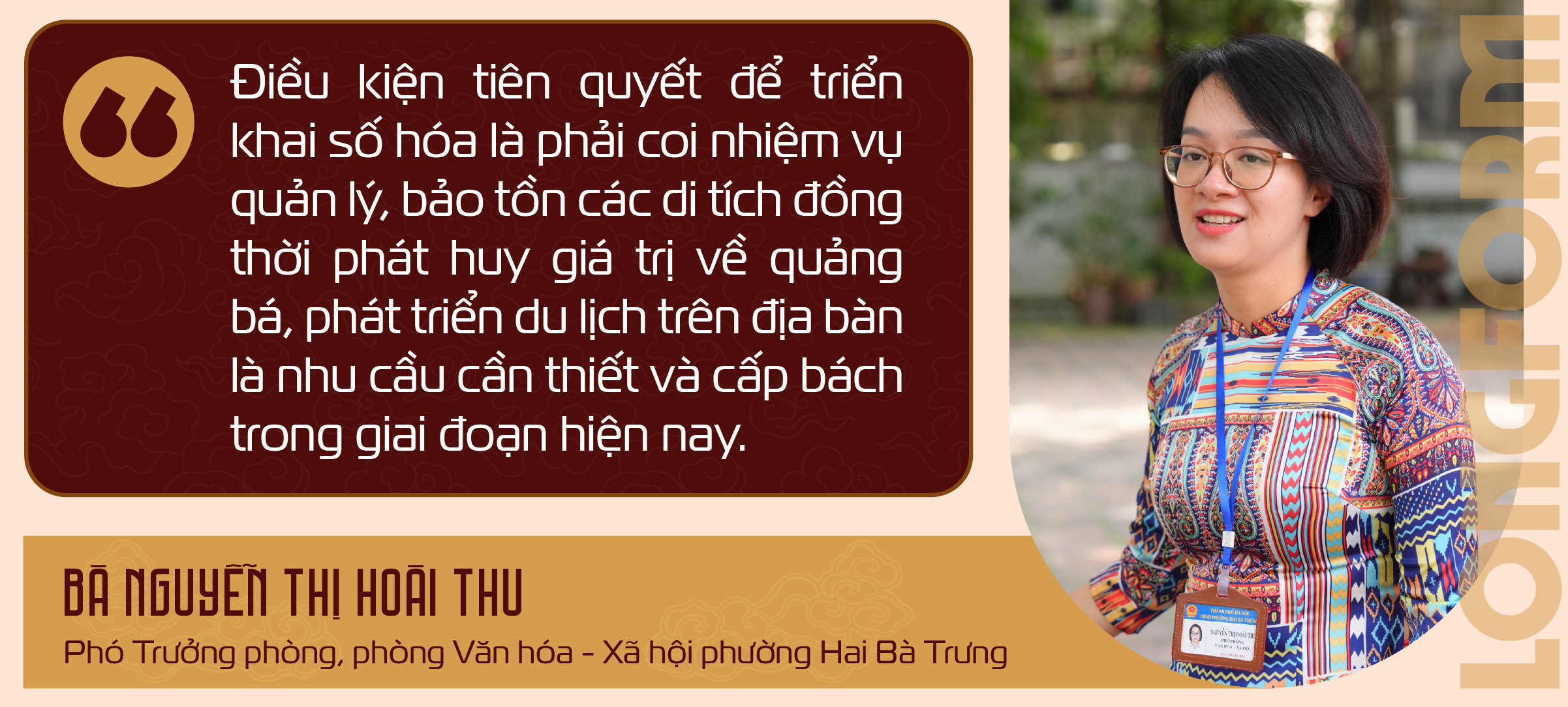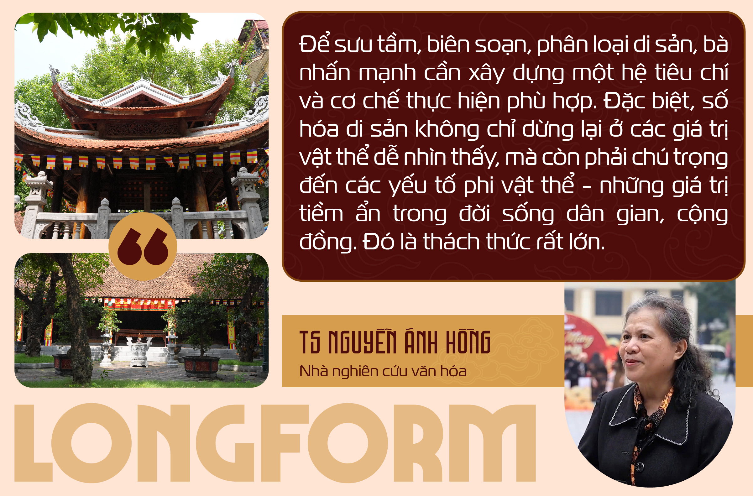 Việt Nam nói chung và Hà Nội nói riêng là kho tàng khổng lồ về di sản văn hóa, không chỉ có di sản được thế giới công nhận mà còn có nhiều di sản cấp quốc gia, cấp tỉnh... Việc số hóa toàn bộ là một nhiệm vụ đầy thách thức. Bà cho rằng, điều này đòi hỏi phải có nền tảng công nghệ thông tin đủ mạnh, song công nghệ chỉ là công cụ. Quan trọng hơn là cần đội ngũ nhân lực có chuyên môn - những người biết sử dụng công nghệ để triển khai quy trình số hóa.