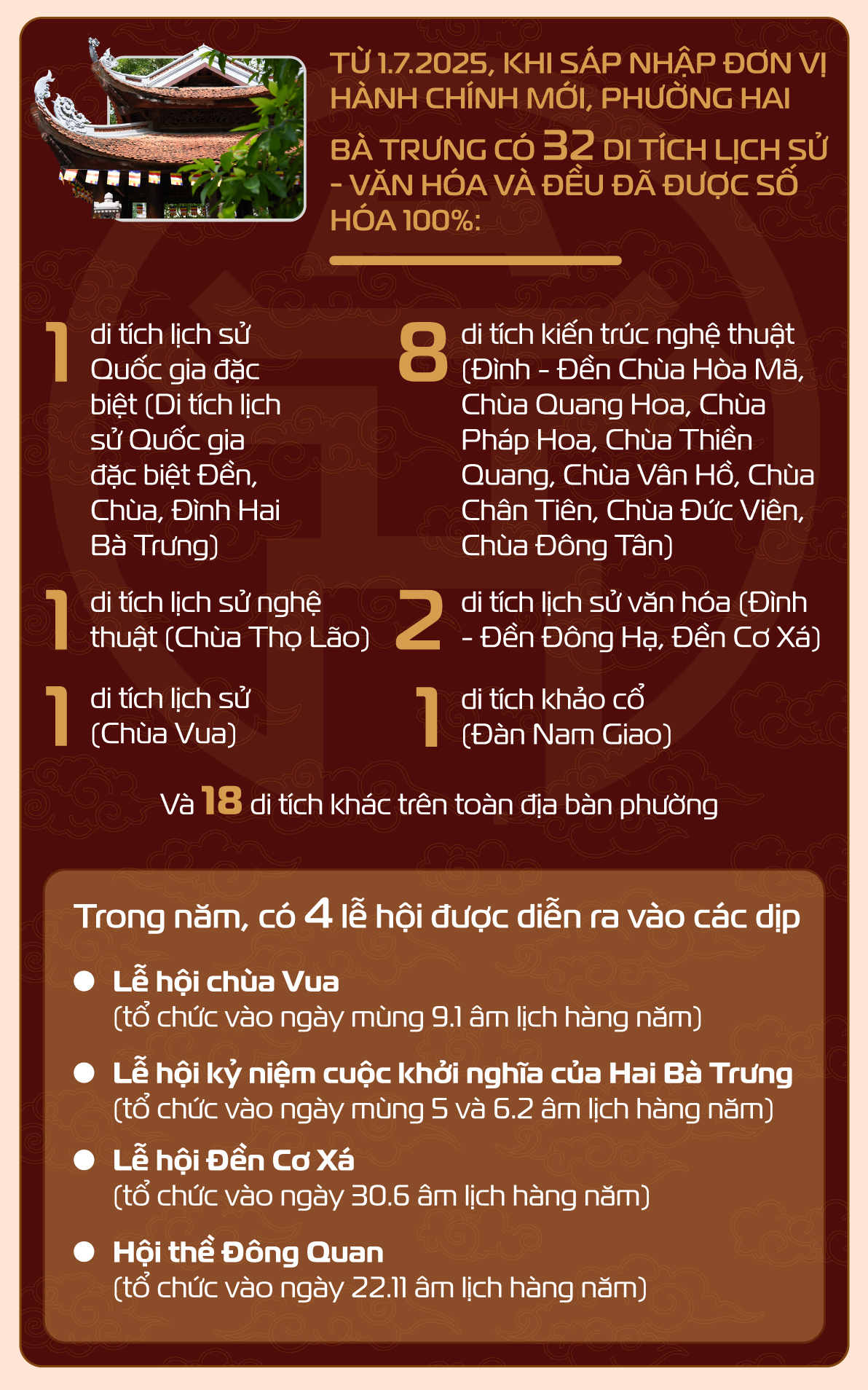 Chị Đào Thị Thu Phương - Chuyên viên Phòng Văn hóa - Xã hội, phường Hai Bà Trưng - cho biết, sau khi thực hiện sáp nhập địa giới hành chính, công tác quản lý di tích trên địa bàn gặp không ít thách thức, đặc biệt là vấn đề nhân lực và khoảng cách địa lý. Các di tích ở phường Hai Bà Trưng chủ yếu là các đền, đình, chùa, trước đây khi chưa sáp nhập, quy mô nhỏ nên dễ quản lý hơn. Sau sáp nhập, số lượng di tích nhiều hơn nên gây khó khăn trong việc đi lại, giám sát và bảo đảm an ninh trật tự.