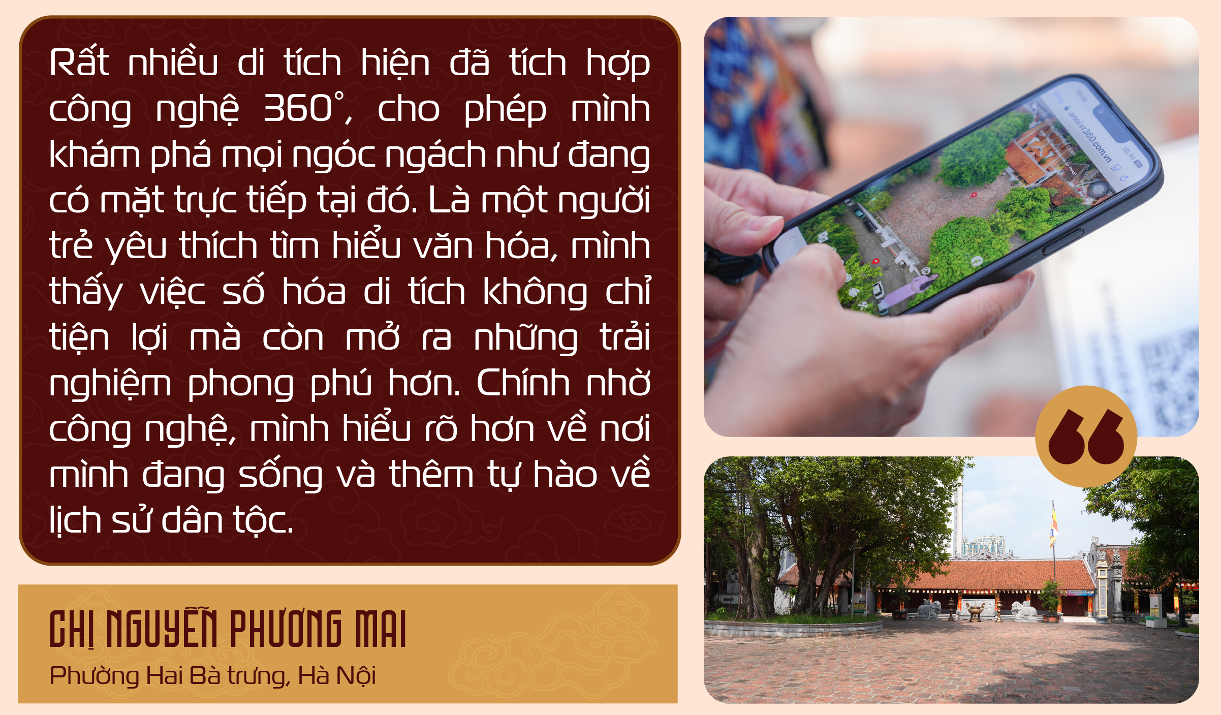 Chị Nguyễn Phương Mai (phường Hai Bà Trưng, Hà Nội) chia sẻ, chị vốn là người yêu thích khám phá lịch sử và thường xuyên tìm đến các di tích văn hóa tại Hà Nội để tìm hiểu về quá khứ dân tộc. Trước đây, mỗi lần muốn hiểu sâu về một di tích nào đó, chị thường phải cất công di chuyển và có sự đồng hành của hướng dẫn viên để được cung cấp thông tin đầy đủ.