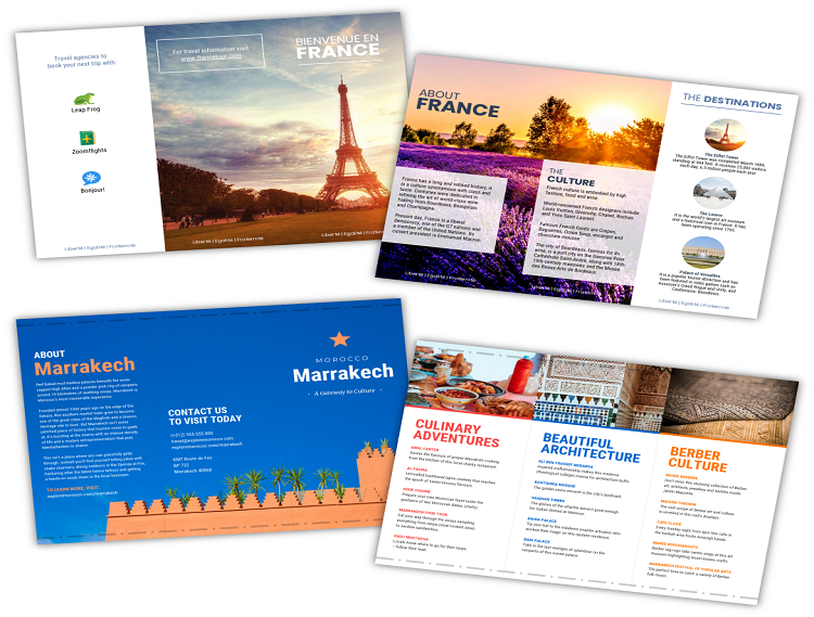 - Các nội dung trong mẫu Catalogue Brochure Du lịch nên kết hợp hài hòa với hình ảnh để người xem dễ nắm bắt được những thông tin cần thiết về địa điểm du lịch đó.